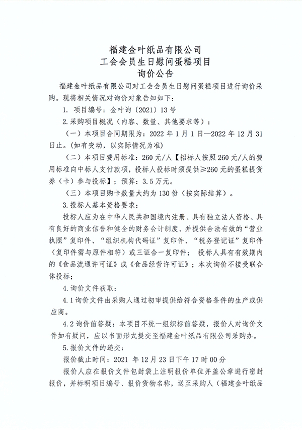 福建金葉紙品有限公司工會會員生日慰問蛋糕項目詢價公告