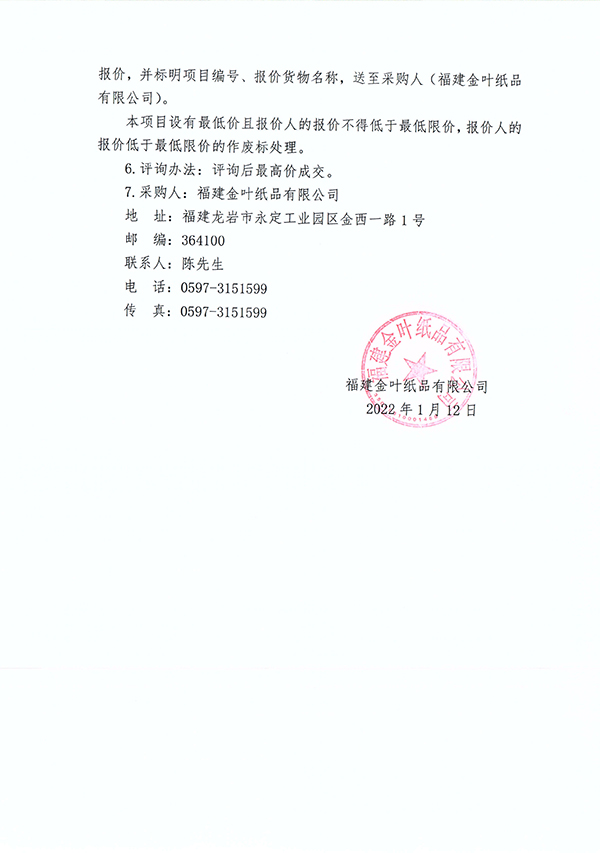 福建金葉紙品有限公司廢舊設備處置項目詢價公告