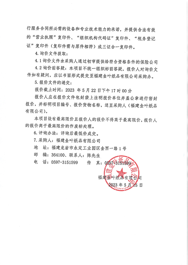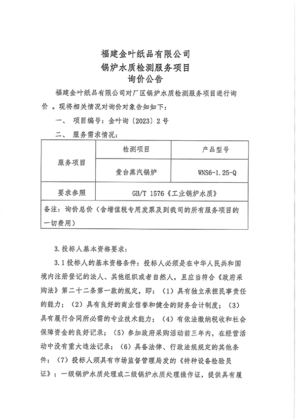 金葉紙品公司鍋爐水質檢測服務項目詢價公告