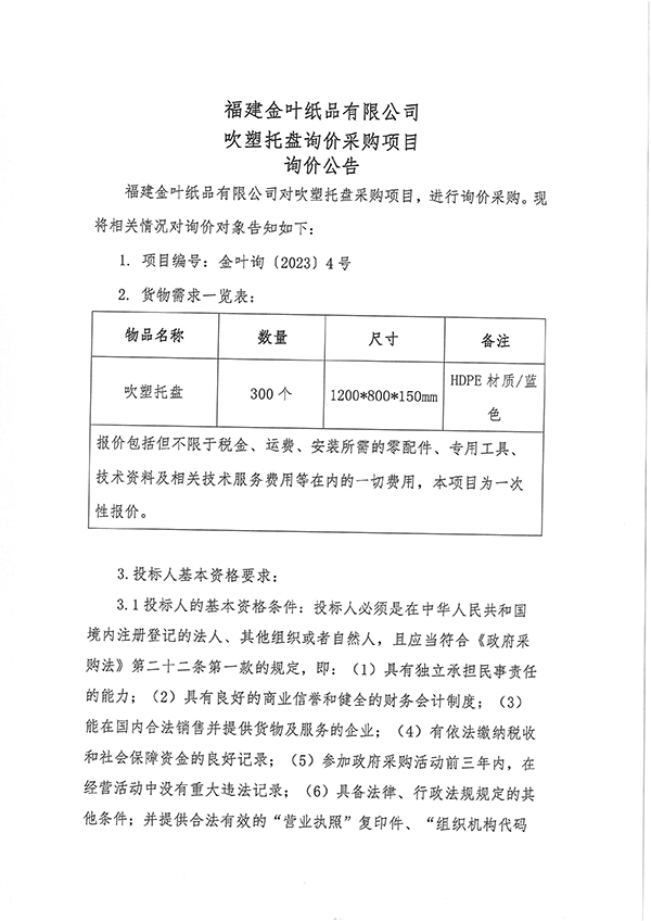 福建金葉紙品有限公司吹塑托盤(pán)采購(gòu)項(xiàng)目詢價(jià)公告